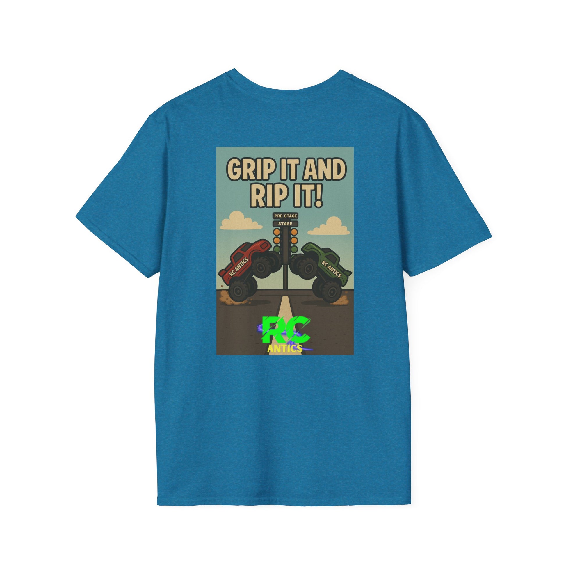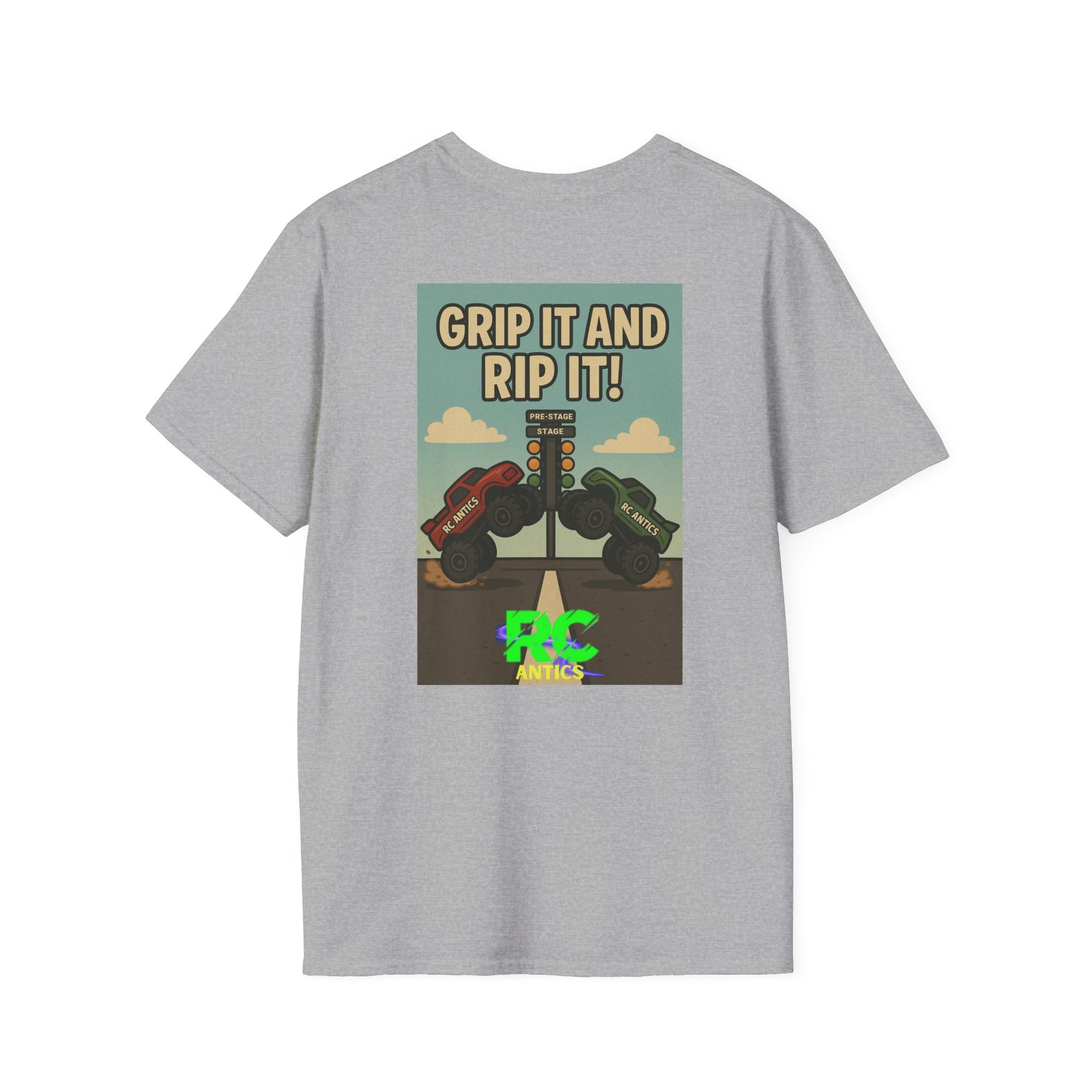 Grip it and Rip it RC Drag Racing The unisex soft-style t-shirt puts a new spin on casual comfort. Made from very soft materials, this tee is 100% cotton for solid colors. Heather colors and sports grey include polyester. The shoulders have twill tape for improved durability. There are no side seams. The collar is made with ribbed knitting to prevent curling damage.